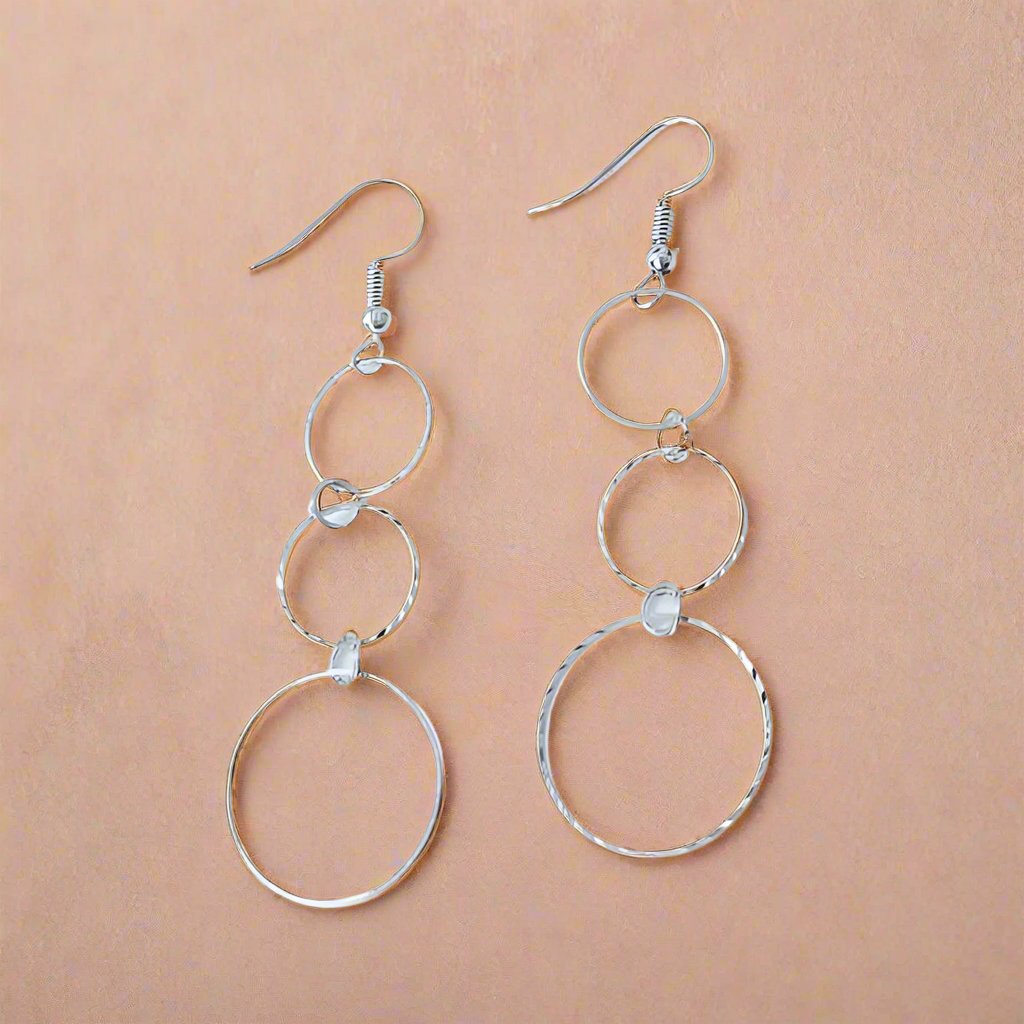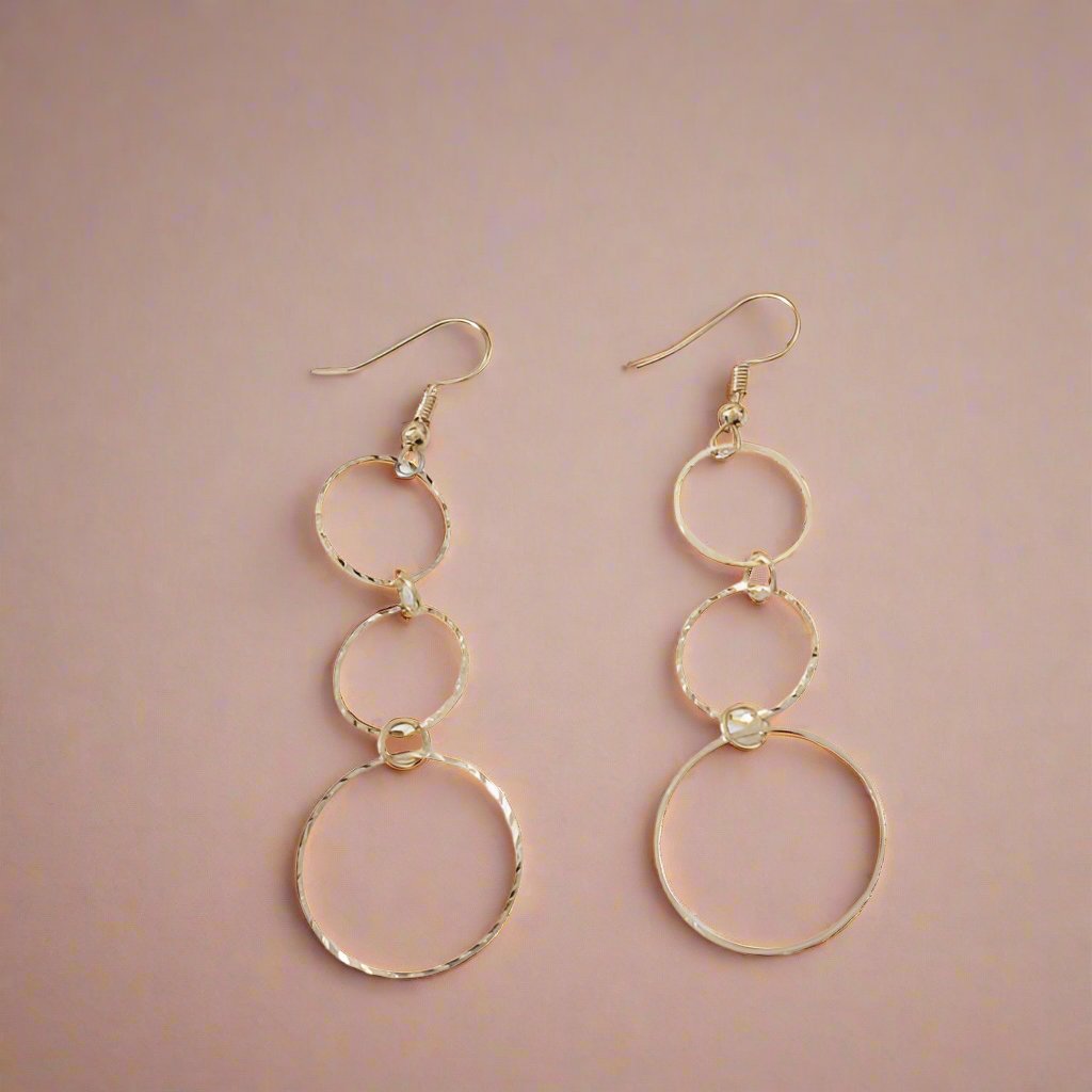 Edgy but not outrageous. Three graduated sizes of diamond cut circles dangle dramatically from a hook. The texture adds a gleaming sparkle. At 2.75 inches they are just the pop that every outfit needs. Available in silver or gold.