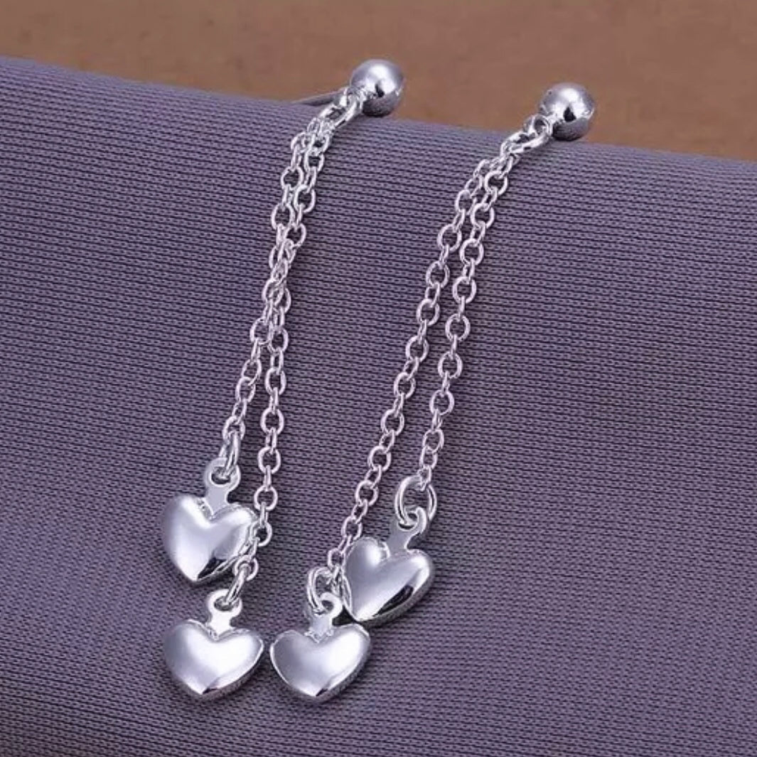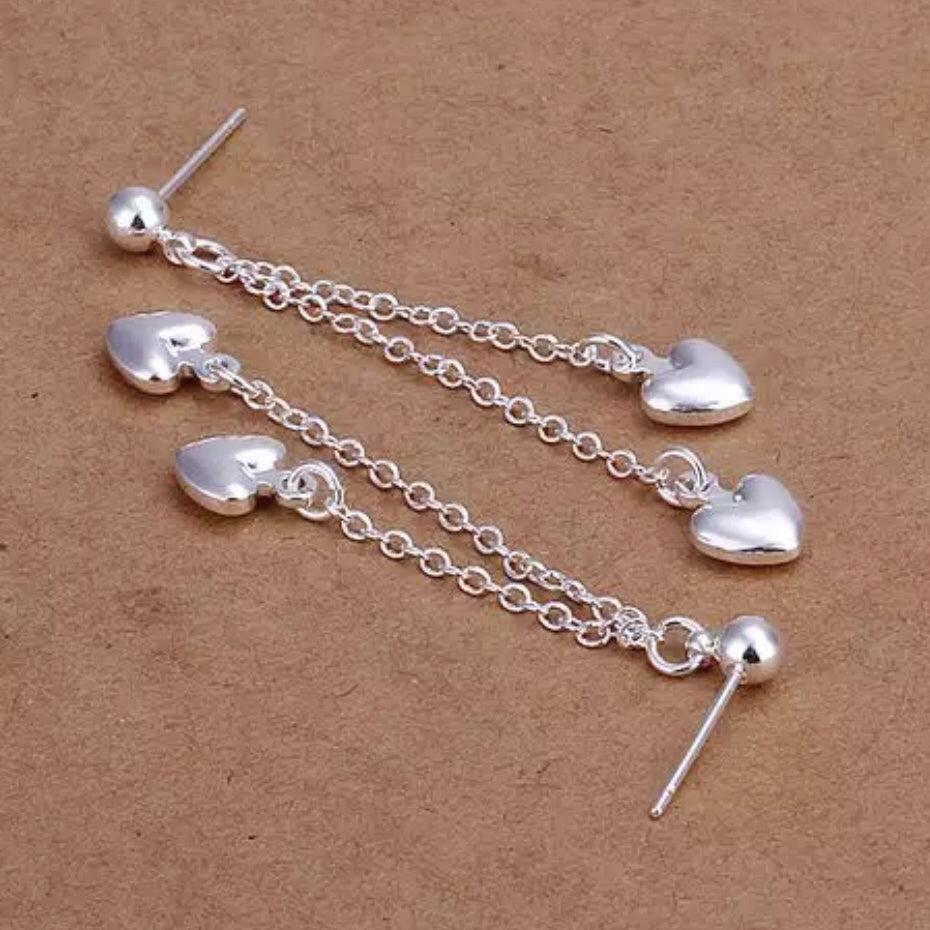 What's better than one heart? TWO! Stud earrings with two chains each hold a silver puffed heart. A sweet gesture, pop of silver shine and an eye-catching set!