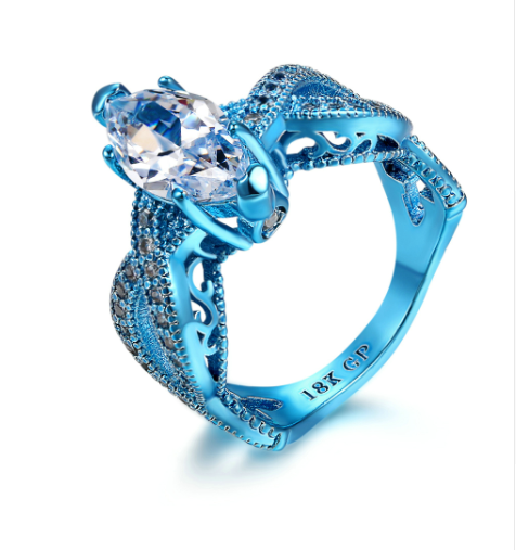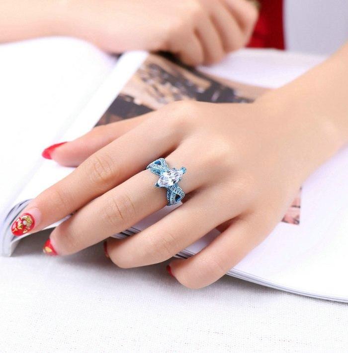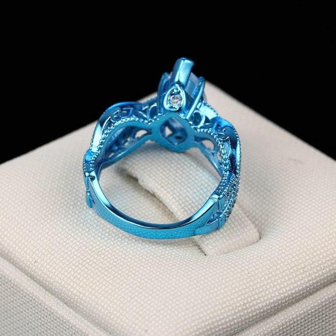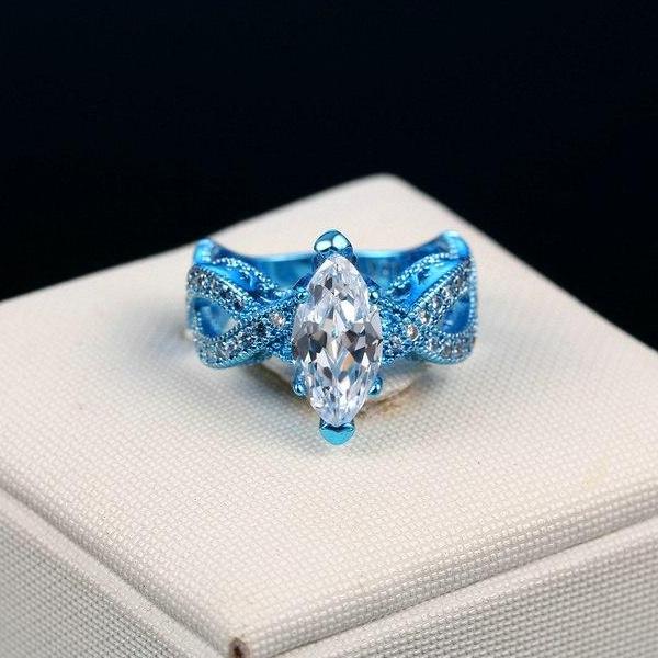 The most unique ring ever imagined! A braided band lined in cubic zirconias is a gleaming vision of electric blue. The winding stones meet at a magnificent marquise-cut cubic zirconia. Peeking from each side of the cathedral is a "surprise diamond" accent. This will make a one of a kind engagement ring and a definite conversation starter.