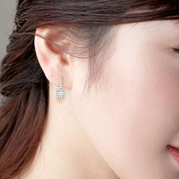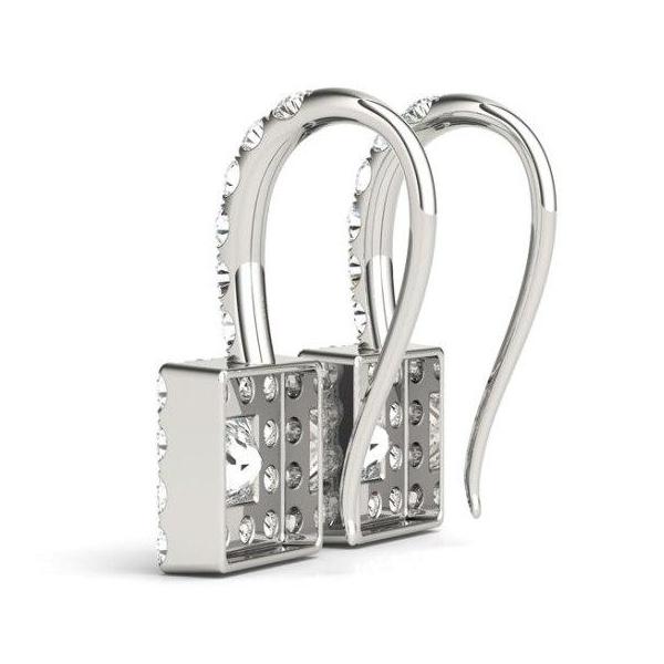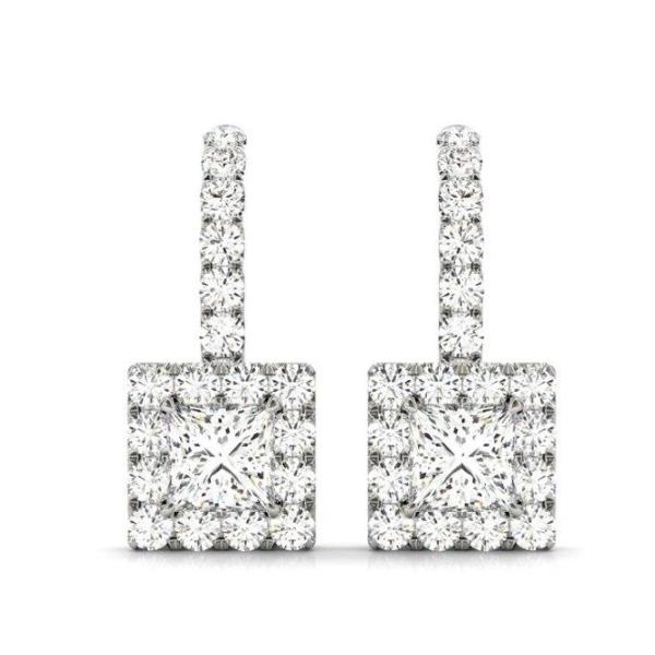 These unique earrings feature a square halo of round prong set stones giving the impressive centerpiece an even larger appearance. A delicate row of stones graces the earring hook. Using only the most premium quality, highly polished, white gold plating for the cage setting and hinged post closure, the effect is truly exquisite. At almost 1 inch in length, they emit fire and radiance at every turn. Pairs perfectly with our Bianca Princess Cut Halo Ring