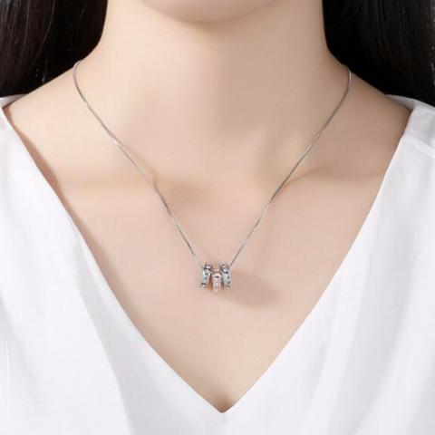 This designer inspired necklace features three individual circles strung along a silky chain. Each circle has a line of channel set CZ stones for added sparkle. An interesting and unique necklace.
