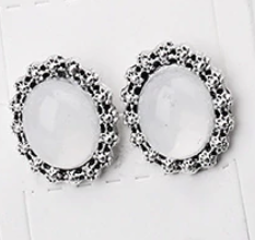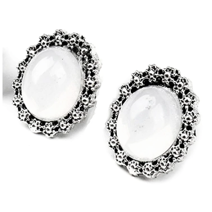 Simple but elegant with a bit of vintage flair. The white opalescent centers are accentuated by the patina metal settings. Sure to get compliments.