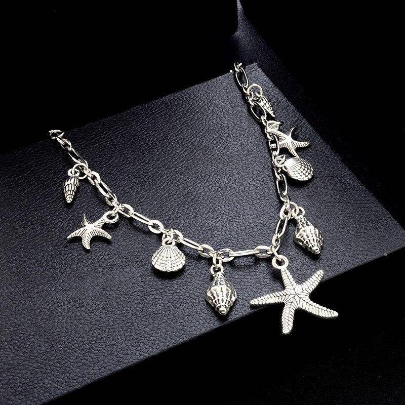 All the treasures of the sea dangle along this interesting chain. Conch, seashells, and starfish dance alongside the large center star. Each is detailed with etching and burnished with black for realism and depth. Glamorous beach or cruise ship wear.